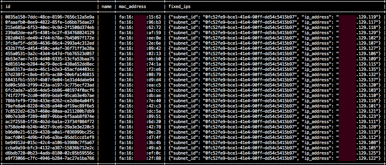 其中id列在后面port-update需要使用,fixed_ips对应每一个port绑定的固定ip,我们实际需要修改的正是这里的fixed_ips